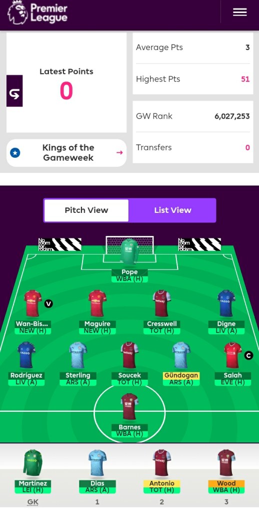 • Playing percentages selecting highly owned players/hedging my bets somewhat in terms of having players starting in Sky FF and not starting in FPL, weary of players being not fit or fully fit and possiblity of rotation with the UEFA Champions League being back in action, therefore, giving myself the possible option of getting lucky with auto(subs) if needs be.