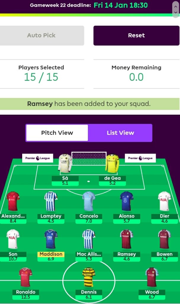 Dennis (providing that he is selected, given the AFCON talks, but as far as I know he is officially available for selection) and/or King (Dennis is right up there for goals and assists in the league in 2021/22, appears to be more of the 9 out of the two and is having a really impressive debut season in the Premier League). { They are both a threat, fresh having not played much recently because of postponements, link up well and get in to decent positions – a significant amount of Watford’s recent goals have been assisted or scored through Dennis and King).
