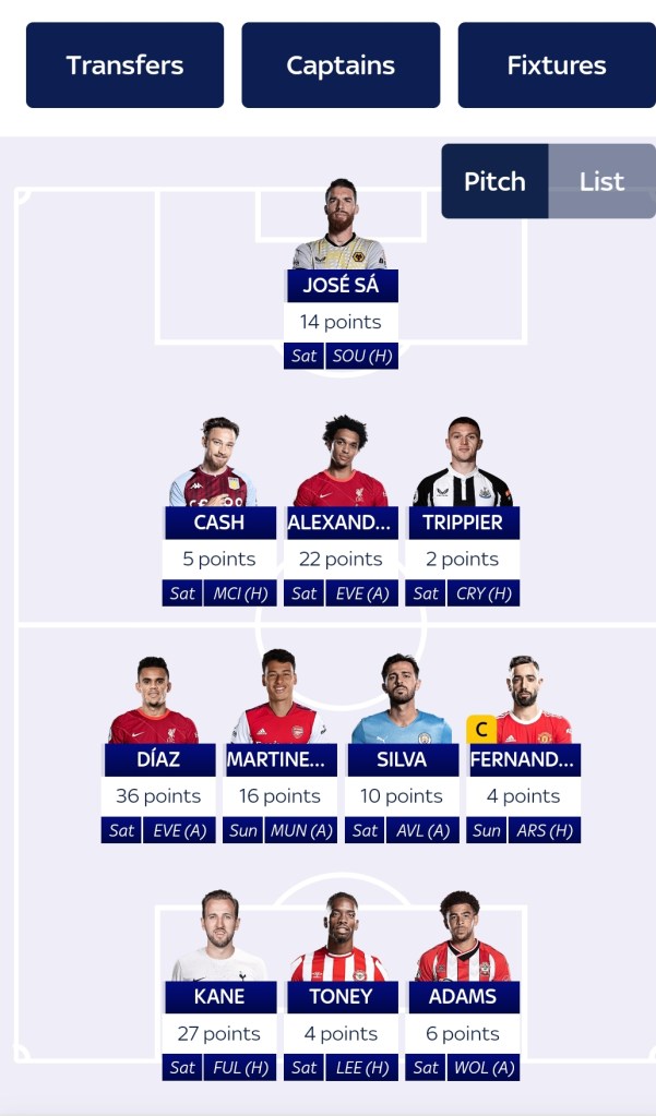 Forest are conceding chances galore but still. Cancelo bagged. Salah did bits. Got Martinelli in both. Can’t wait for the -1 auto from Williams. One of them. Think it’s the first time that’s ever happened to me in Fpl – getting a negative return from the bench. I’ll collect that weird badge of honour. Rubbish jokes aside, Jesus put the round thing in the retungular thing again.