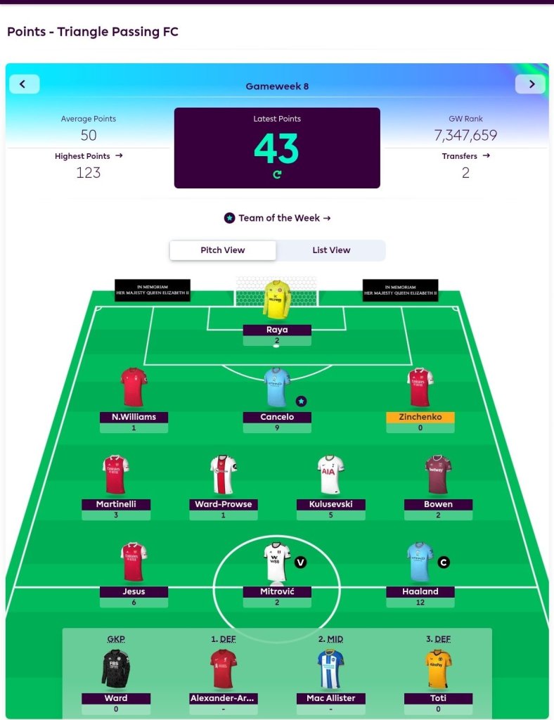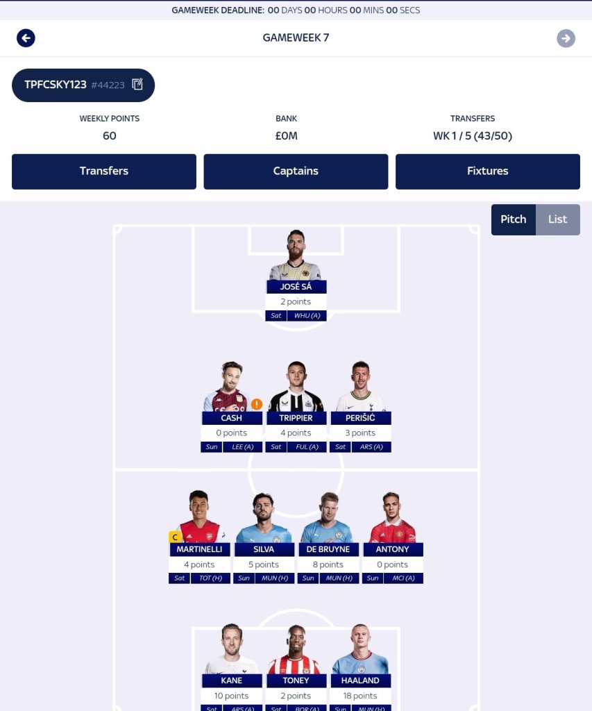 Made a few transfers yesterday (Saturday, as in 17/09/22), 7 transfers made overall this season with 43 left, plus 2 wildcards effectively or whatever they’re called in Sky Sports FF – assuming they’ve still got them this season – I’m such a casual.