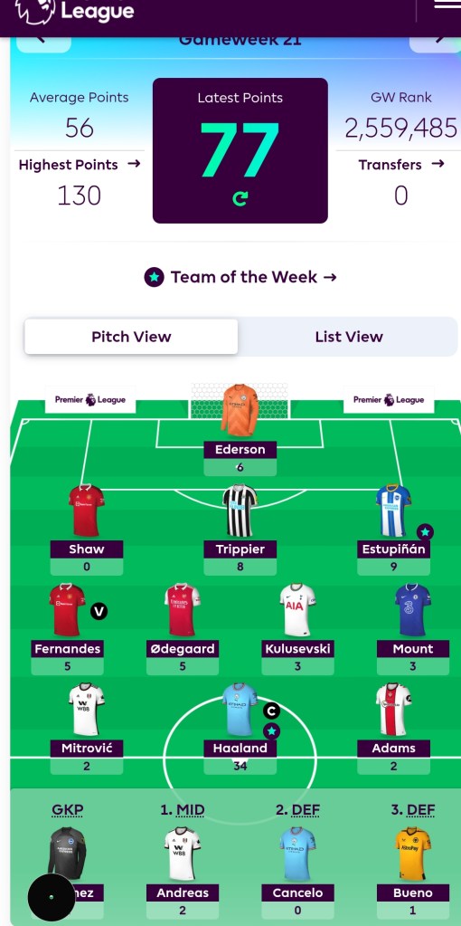 Some players do bits to contribute to a really brilliant GW score really – I’m not doin’ of this humble brag lark – obviously I’m happy with that score with no transfers used either. Some got more 2s than…insert joke here…don’t know haven’t got one lady/lid.