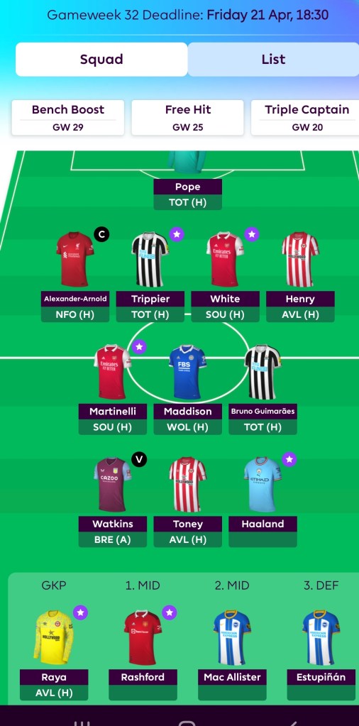 Got a fair few playing at home, Arsenal continue to mount a title challenge, Maddison was bright and freed up in the second half against Manchester City (3-1) in GW31, Watkins continues his impressive form, Trippier is up there for assists from defenders too.
