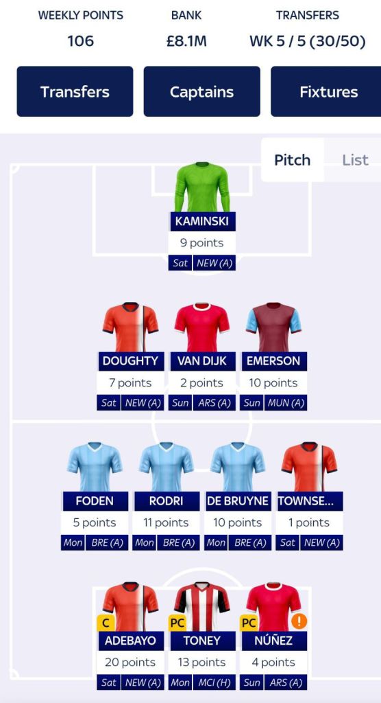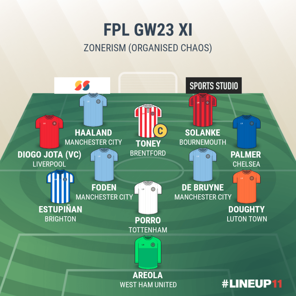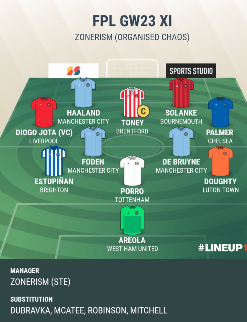 With this is mind, 4 players from said teams make the XI this week as Brentford Vs Manchester City may turn out to be a high scoring match on MNF (Monday Night Football), so Ivan Toney (captain), Phil Foden, Kevin De Bruyne and Erling Haaland feature.