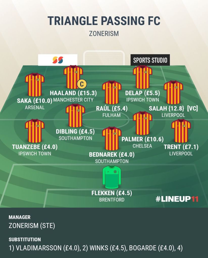 Notable players include Palmer, Saka, Trent, Salah & Haaland – Palmer y Saka continue to quietly rise up in terms of attacking returns – and a few cheap budget players feature (Tuanzebe, Dibling, Delap and Raúl), as they could offer value, and/or act as enablers to help fund premium/heavy hitters (happy to have all of Haaland, Palmer, Saka, Salah and Trent in place after playing my wildcard in GW5 and having been gradually building up my team to this point).