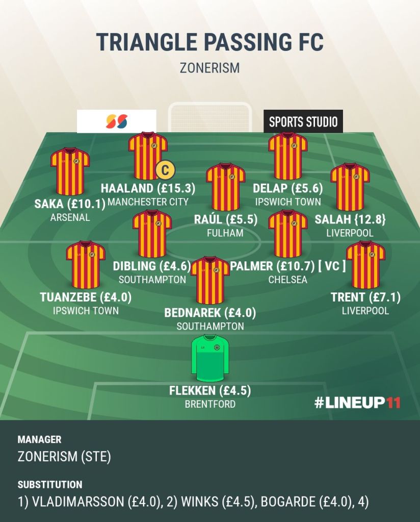Likes of Haaland (Captain), Palmer, Salah, Saka, Trent could get joy this week against sides that have some of the poorest defences this season, some of which said players have home advantage, one or two of said players may face a challenge or a slight hindrance of playing against sides effectively playing a back five off the ball (or a low block) or against sides that are well set up to make it difficult against teams playing at home (as in Nottingham Forest/not conceded many goals away from home), but the aforementioned players rank highly for points scored in FPL in 2024/25 and are absolutely capable of returning well against any side on any given day.