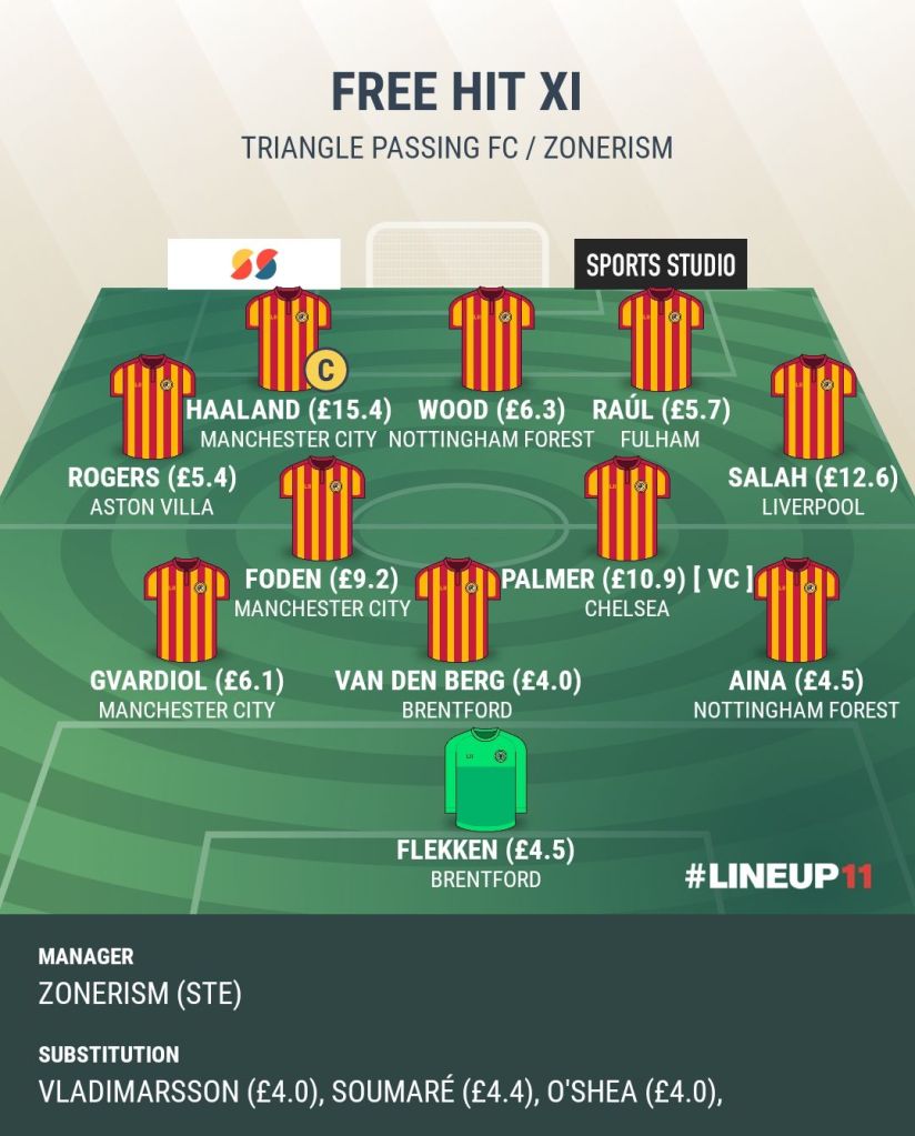 Flekken; Aina, Van Den Berg, Gvardiol; Salah, Palmer (VC), Foden, Rogers; Raúl, Wood, Haaland (Capitan)